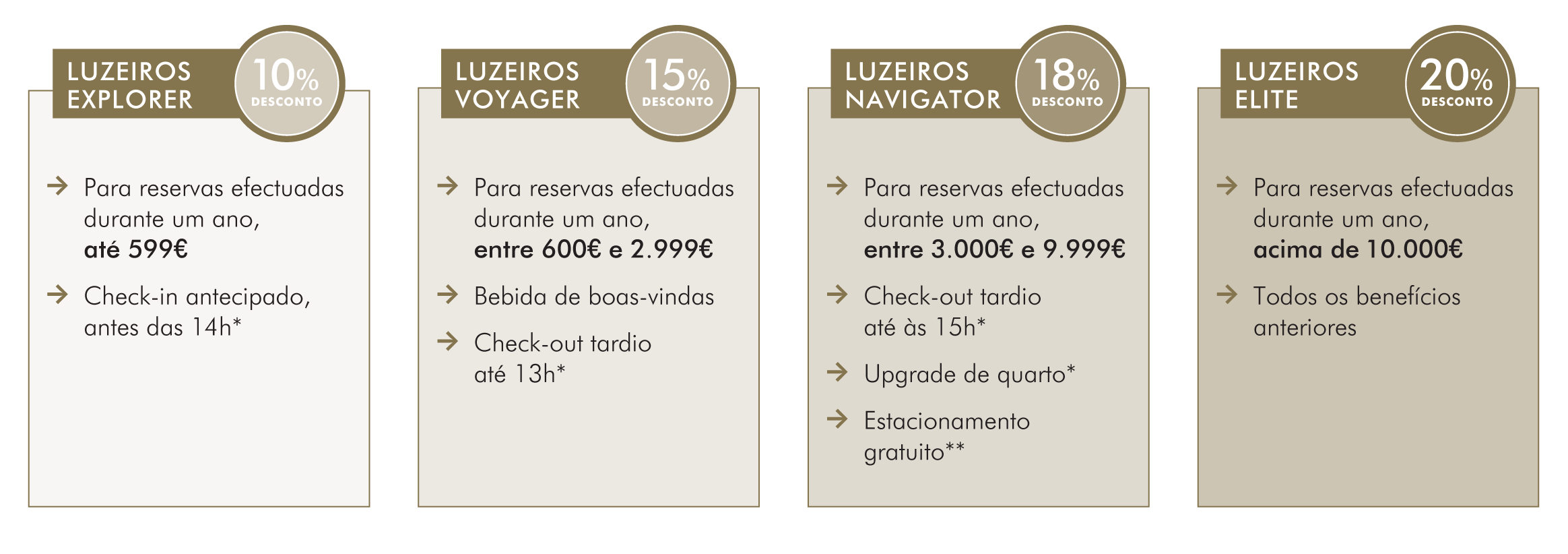 Ao reservar diretamente connosco, em luzeirossuites.com, acumula o valor das suas estadias. O valor acumulado, durante um ano, estadia após estadia, vai permitir-lhe progredir nos níveis do programa e desfrutar de descontos exclusivos e benefícios adicionais.