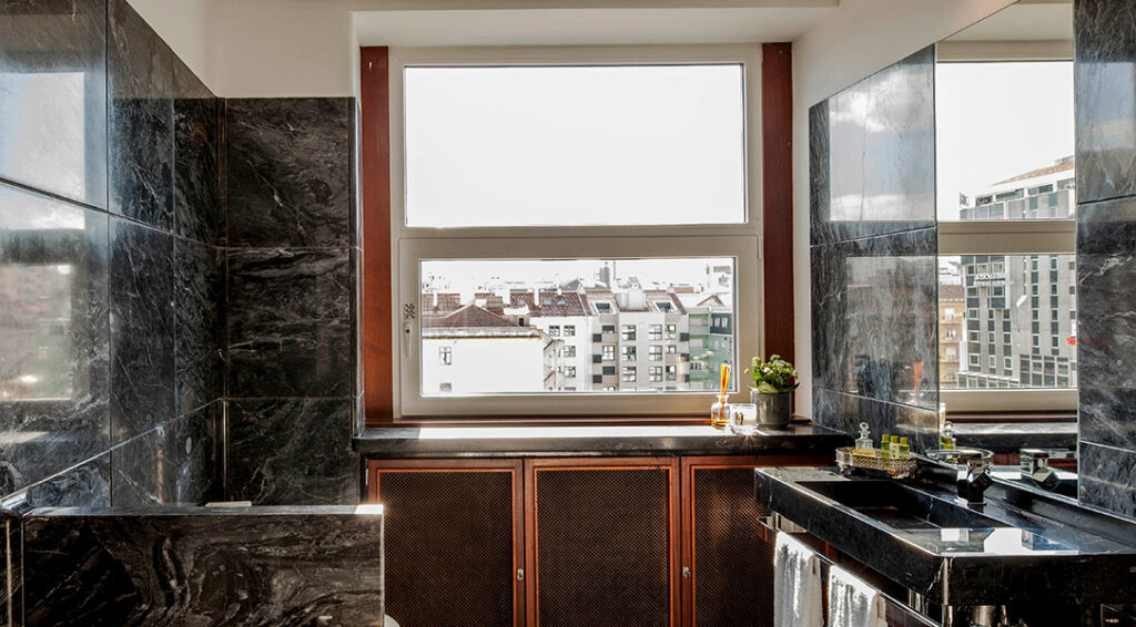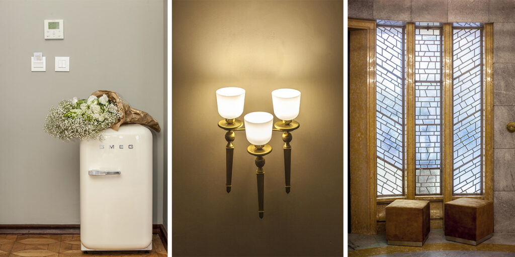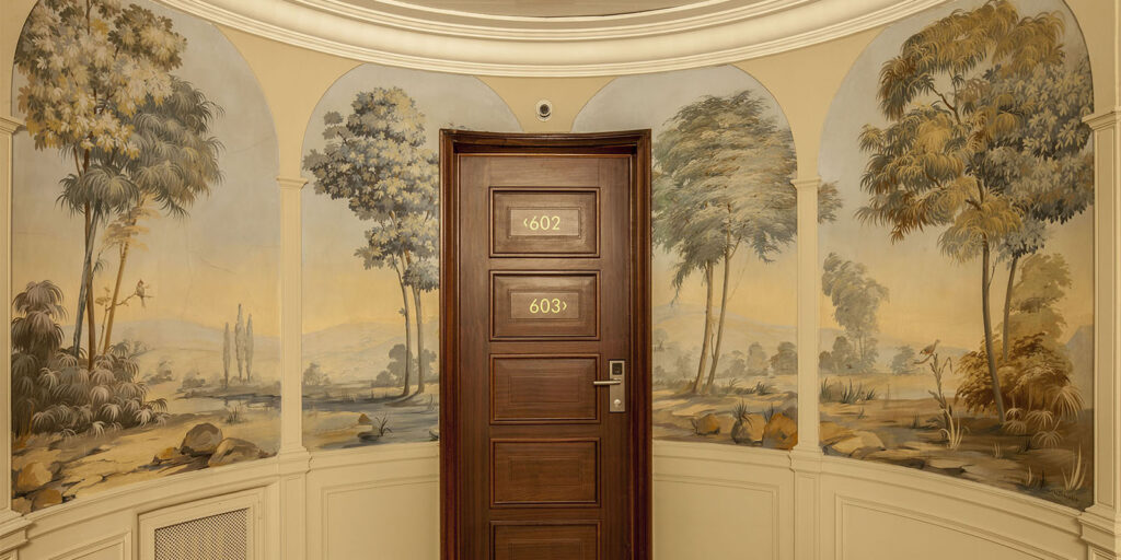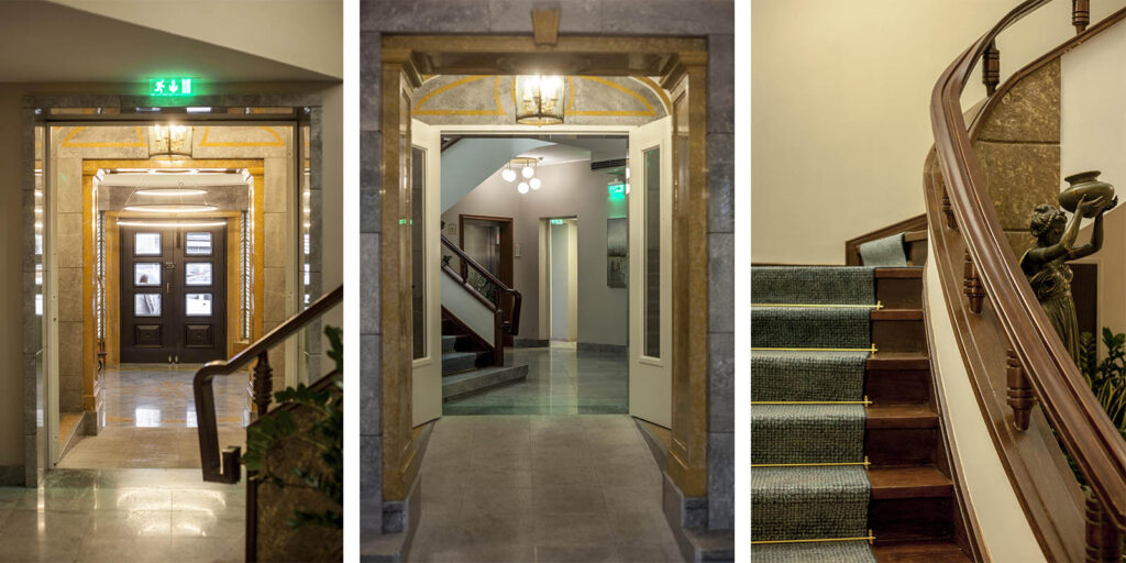 Convido-vos a subirem ao primeiro andar, ao passarem no hall da recepção não deixem de apreciar o magnífico envidraçado que permite a entrada de luz natural no espaço, a antiga cabine do elevador, que serviu o prédio durante 57 anos, espreitem o seu interior que remete para o interior de uma caleche. Observem as luminárias de tela nos corredores, os frescos do artista plástico António Basalisa, no 6º piso, e os nichos trabalhados em madeira. Entrem nas suites, apreciem os magníficos pavimentos com embutidos de madeira e as antigas lareiras existentes em algumas delas. Nas casas de banho retenham as amplitudes e vistas, os mármores que revestem as paredes, as divisórias e bases de duche, assim como as banheiras originais, todas elas recuperadas. Por fim, o trabalho em madeira na escadaria interior e de alvenaria no exterior, para mim, verdadeiras esculturas.”